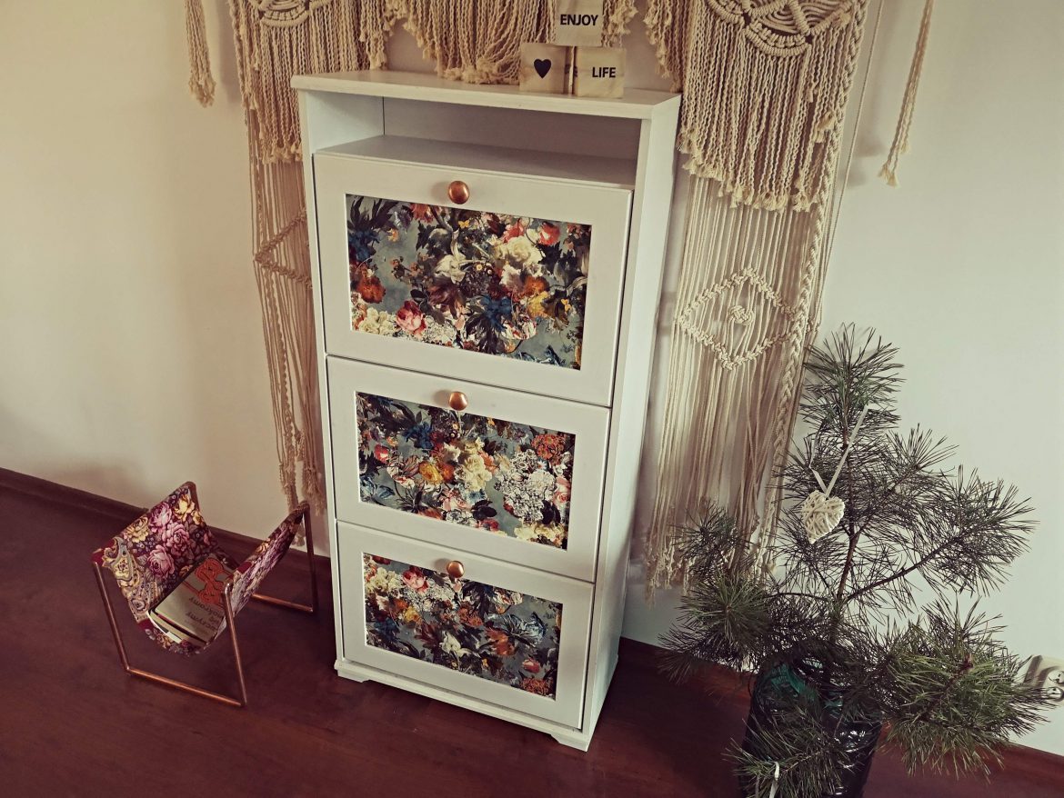 Oto kolejny, kwiecisty projekt, czyli szybka metamorfoza szafy Ikea! Wystarczy ok. 40 minut wolnego czasu, kawałek tapety i nowe gałki, a można mebel twórczo zaczarować 🙂