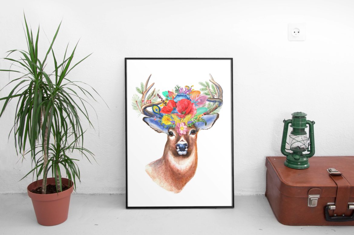 I od razu dementuję, nie ja go malowałam. To grafika, która posiada darmową licencję do użytku komercyjnego i nie wymaga przypisania. Pobawiłam się nią w programie graficznym i możecie do woli z niej korzystać. Ten plakat z jeleniem, będzie pasował zarówno do wnętrza skandynawskiego, jak i modnego aktualnie stylu boho. Mam nadzieję, że Wam się przyda. Jeśli zawiśnie w Waszej domowej galerii, koniecznie dajcie mi znać!